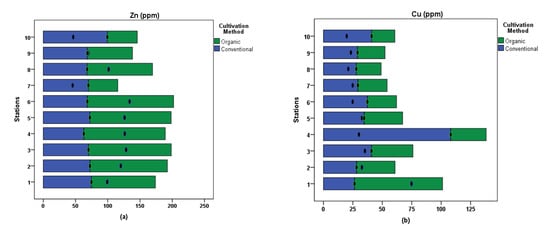 The highest Cu content was 37.55 ppm at station 8 in the water samples taken from the regions where organic farming is carried out and 79.25 ppm at station 10 in the samples taken from the regions where conventional farming is practiced (Figure 2b). When the water samples taken from the organic and conventional production areas were compared in terms of total Cu content, the Cu level was higher in the water samples taken from the organic farming areas.