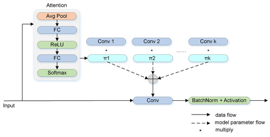 Over the years, CNN-based algorithms have made significant progress in the image processing area. However, convolution operations use the same convolution kernel weights for all inputs, which limits the representational capacity of the model. Thus, to increase the complexity of the network, researchers extend the width or depth of the network, which consumes considerable computational resources [36]. Therefore, Chen Y et al. proposed dynamic convolution, which can considerably increase the network complexity without expanding the model’s scale [37]. Standard convolutional operations use the same convolutional kernel weight for all input images, which may lead to weak representational ability and poor prediction for some complex input images [38]. Dynamic convolutional networks can dynamically calculate the parameters of convolutional kernels based on input images, thereby enabling better feature representational abilities of the model [36]. Compared with standard convolution operations, dynamic convolution can utilize prior knowledge of input images to dynamically adjust convolutional kernel weights to enhance feature representation capabilities and thereby improve model performance [38]. The calculation process of dynamic convolution is displayed in Figure 3. In contrast to ordinary convolution operations, dynamic convolution involves dynamically calculating the attention weights of multiple parallel convolution kernels, then aggregating the attention weights of these kernels to obtain the final kernel weights [37]. The inputs vary, and the dynamic convolution kernel weights also change accordingly.