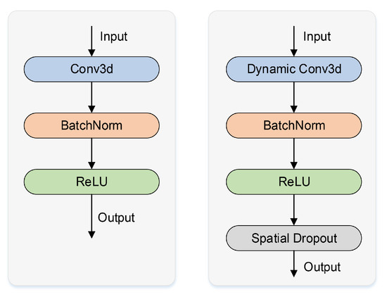 In this paper, a dynamic convolutional block named dy-block is designed as a substitute for the original 3D U-Net convolutional block (conv-block) to increase the model’s representational ability. Dynamic convolution is a new form of convolution that can dynamically calculate the weights of convolution kernels based on the characteristics of inputs. Compared with standard convolutional kernels, dynamic convolutional kernels have prior knowledge of inputs and can extract features with stronger ability. The dy-block designed in this work has better feature representational capabilities compared to the conv-block of 3D U-Net. The framework diagrams of the conv-block and the dy-block are shown in Figure 4. The dy-block includes a dynamic convolutional layer to extract features, a batch normalization layer to speed up the convergence of the 3D U-Net, a ReLU layer to enhance the nonlinear representation ability, and a spatial dropout layer to reduce the risk of overfitting. Compared to the framework of the original conv-block, the dy-block can significantly increase target segmentation accuracy without expanding the model’s depth or width.