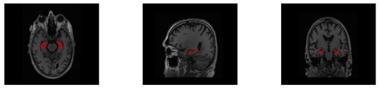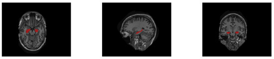 The segmentation labels of the MICCAI dataset are multi-atlas, including 15 different labels, such as amygdala, caudate, hippocampus, etc. Howerver, in this work, only the labels of the hippocampus are useful. Thus, the segmentation labels of the hippocampus are first separated from the multi-atlas MRI images of the MICCAI. The processed MICCAI labels are displayed in Figure 8.