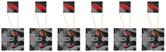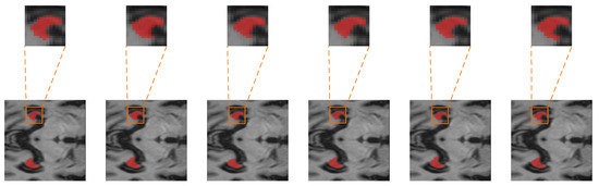 For convenience of display, the segmentation labels are mapped in the original images with the same resolution between the raw MRI image and its hippocampus segmentation label in the HarP and the MICCAI datasets. We set the corresponding hippocampus label pixel in the original MRI image to a specific value to represent the hippocampus, and other non-hippocampus pixels were kept unchanged to distinguish them from the hippocampus. The visualization segmentation results of the HarP and MICCAI datasets are displayed in Figure 6 and Figure 7, respectively. The area with a red pixel represents where the hippocampus is located, and other pixel values are non-hippocampus areas.