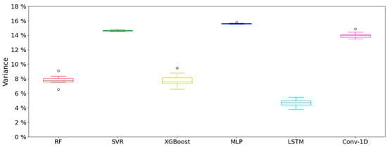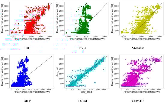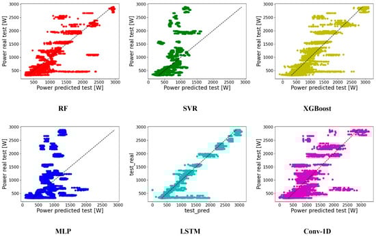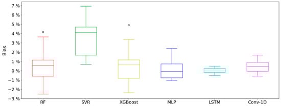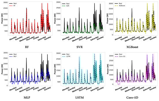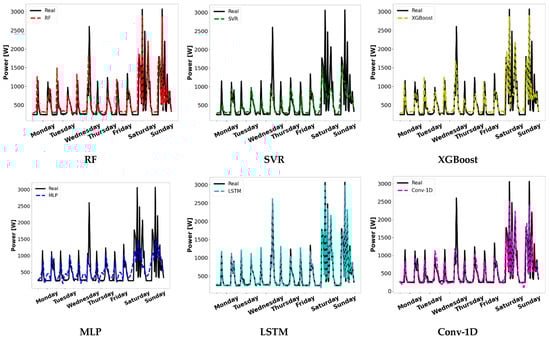 In [25], various techniques for predicting building loads are compared. LR, LSTM and ARIMA are used. The evaluation of the error is performed using RMSE and mean bias error (MBE). This same comparative analysis is carried out in [26], where the authors compare MLP, SVR, RT, linear regression (LR) and SARIMA. The performance of the models is determined with R, RMSE, MAE, MAPE and maximum absolute error (MaxAE). This same approach is carried out in [35], where the authors compare ARIMA, SARIMA, XGBoost, RF and LSTM by mean percentage error (MPE), MAPE, MAE and RMSE metrics. The authors of [36] investigate the use of SVR as a method for load prediction through a comparison with RF, ARIMA, XGBoost, and MLP, and the accuracy is assessed using MAPE.