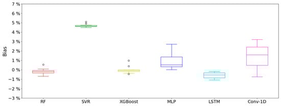 In [33], an analysis is carried out that evaluates the performance of RF, regression tree (RT) and SVR for the prediction of energy consumption in buildings. The evaluation indices are MAPE, R2, RMSE and PI. In [34], the authors compare the gradient boosting (GB), RF, and time of week and temperature model (TOWT) methods for predicting energy consumption in buildings by applying cross-validation. In this analysis, the performance of the models is evaluated using R2, coefficient of variation of the RMSE (CV(RMSE)) and normalized mean bias error (nMBE).
