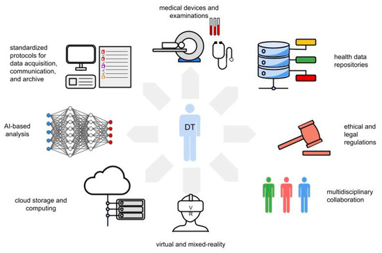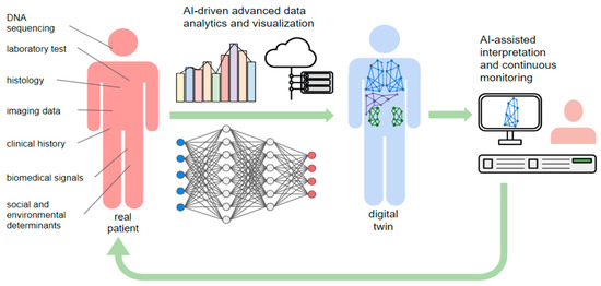 Virtual modeling requires high-performance computing capabilities for processing and analyzing extensive biological data, while maintaining effective predictions of real-time interactions [8,10]. For this reason, the construction of a digital twin has especially led to growing links between big data companies, which own the computational and storage resources, healthcare companies which provide the data, and biomedical research centers which guide the analysis and interpretation of models [8,10].