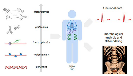 Due to the complexity of biological organisms, the construction of DHTs requires advanced data analytics and visualization tools for multi-scale biological data including three main domains: (1) so-called multi-omics sciences, such as genomics, transcriptomics, proteomics and metabolomics, (2) morphological (anatomical) data, and (3) biofunctional data (for example, cardiac electrophysiology) (Figure 3). A DHT aims to represent the virtual replica of an individual or patient with its distinctive genotypic and phenotypic signature, ideally accounting also for the complex interplay between organisms and the environment.
