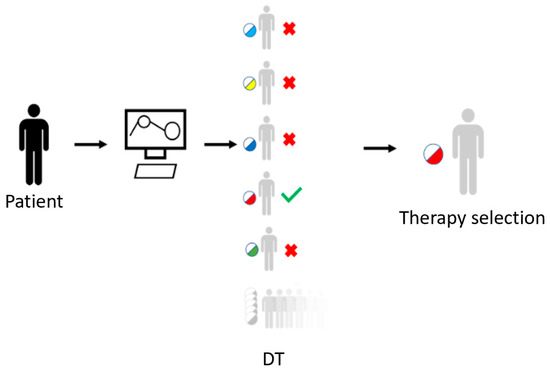 DHT for the selection of target therapies are built on the integration of multilevel data omics and applications, which includes genomics and proteomics, and, from a radiological point of view, imaging features extraction with texture analysis, radiomics, and radiogenomics: these models can be used to simulate the effects of different treatments and predict outcomes, allowing doctors to develop new therapies and improve existing ones and tailor treatments to the individual patient (Figure 6) [33]. Since it is derived from computationally predicted effects of a patient’s high-resolution model instead of previously observed effects on a small number of phenotypic and molecular variables in groups of patients, this prioritization would be far more precise than current treatment methods [19].