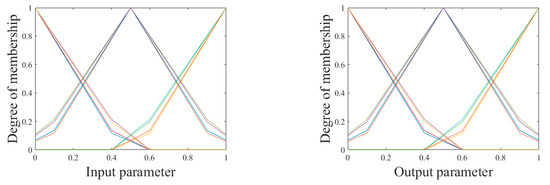 The interval type-2 fuzzy logic controller (IT2FLC), which is represented in Figure 7, implemented to analyze the behavior of the proposed method is composed of interval type-2 MFs (IT2MFs), which are mathematically formulated with Equations (15) and (16).