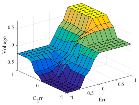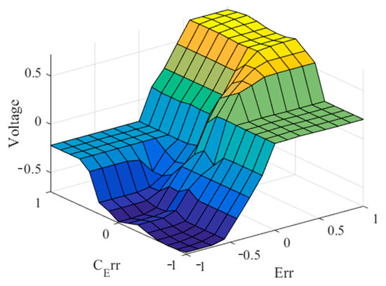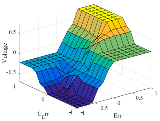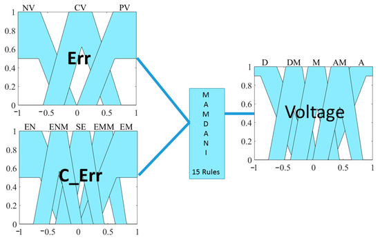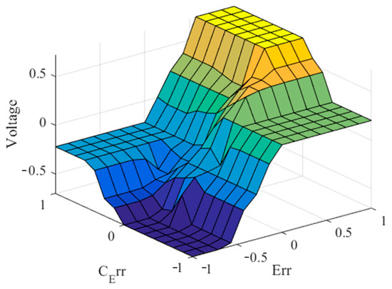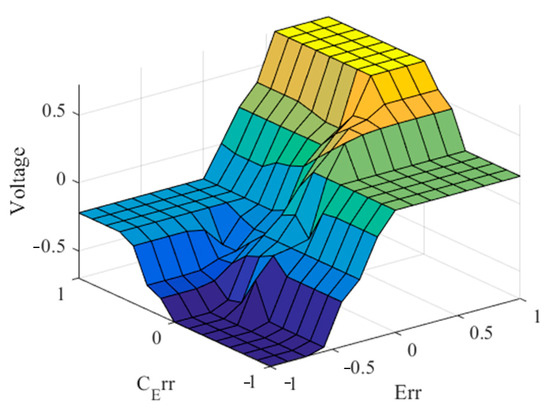 To provide a visual representation of the IT2FLC-MAP, Figure 6 presents a graphical illustration that elucidates the key aspects and dynamics of the control problem. This representation helps in understanding the intricate relationship between the control inputs and the output; we assume that the input of the system is the voltage source applied to the motor’s armature, which represents the manipulated variable, while the output is the position of the shaft .