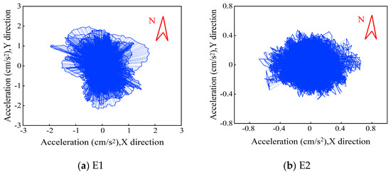 From Figure 4a–d, the maximum acceleration response amplitudes of all 4 earthquakes occur in the X-direction with 1.984, 0.656, 6.573, and 1.027 cm/s2, respectively, and in the Y-direction, the maximum instantaneous accelerations of the structure are 1.784, 0.474, 5.149, and 0.626 cm/s2, respectively. Among them, the acceleration amplitude is the largest under the earthquake of E3. The seismic intensity level, measurement distance, and propagation medium are the main reasons affecting the size of the seismic reaction.