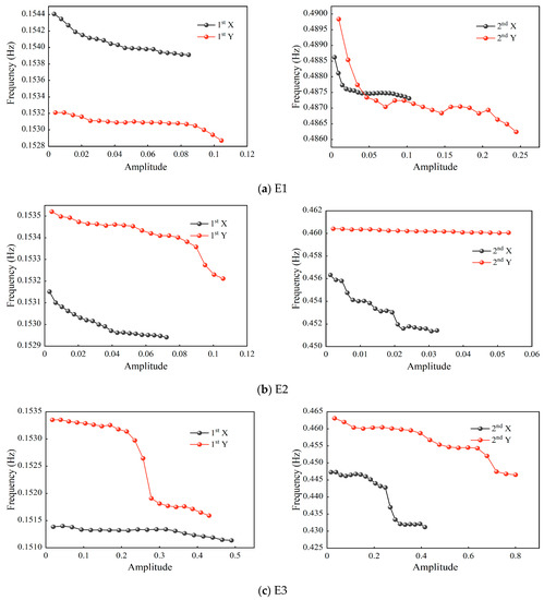 Natural frequency is one of the important parameters used to describe the dynamic characteristics of high-rise buildings, and it is very important to accurately determine the size of the natural frequency in the structural design to evaluate the safety of the structure [36]. To improve the data utilization, the correlation curves of the first two orders of the natural frequency with amplitude in the X and Y directions of the SWFC under four earthquakes were determined. This was achieved by using the E-RDT method based on time-range data of the 101F acceleration response obtained in Figure 4, and by setting 20 intercepts from 0.1 times the standard deviation to 2.5 times the standard deviation (see Figure 8).