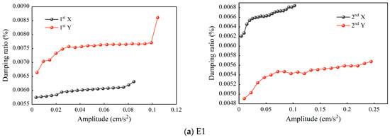 Estimation of the structural damping ratio is essential for the selection of dynamic parameters and the detection of structural damage in the design stage. Similar to identifying natural frequency, the same E-RDT method was employed to attain the correlation and normalization curves of the first two orders of damping ratio with amplitude variation of the top structure of the SWFC under four earthquakes (Figure 10 and Figure 11, respectively). It can be seen that the damping ratios of the first two orders in the X and Y directions of the SWFC under the four earthquakes increase to varying degrees with the increase of the structural amplitude. However, with a further increase of the amplitude, the increase rate of the damping ratio gradually slows down, and the damping ratio is discrete at low amplitudes. This stems from the increased amplitude of the structure, which causes more cracks in the structure, thereby increasing its energy dissipation due to a larger dampening ratio. When comparing the four earthquakes, it is worth mentioning that the damping ratio magnitudes in the X and Y directions are substantially different, and the normalized curves fluctuate considerably. In particular, the first-order damping ratio in the X-direction is 0.77% (E3) and the second-order damping ratio is 0.68% (E1). In the Y-direction, the first-order damping ratio is 0.86% (E1), and the second-order damping ratio is 0.65% (E2). This indicates a difference in the energy dissipation of super-tall buildings in response to earthquakes.