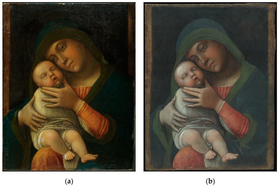 The object of this study is the Madonna with Child by Andrea Mantegna (Figure 1a,b), painted around 1490–1499 and belonging to the collection of the Poldi Pezzoli Museum in Milan (Italy). It is a small-sized portrait, roughly 45 cm × 35 cm, on linen canvas of the Virgin with the Child and belongs to a group of small-format Madonnas produced for private devotion. Similar to this painting, there is the Madonna with Child of the Accademia Carrara in Bergamo (Italy), which underwent conservation processes in 2012 [38] at the OPD—as happened to the Madonna Poldi Pezzoli a few years later, in 2019 [39].