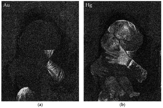 There are other elements detected which are most likely related to Molteni’s intervention. For instance, the presence of Co traces in the mantle of the Virgin, particularly over the shoulder and in the border (close to the edge of the painting), may be due to the use of Cobalt blue by Molteni himself or to an earlier intervention with smalt (a blue Co-based glass pigment employed in painted works from the mid XV century [48]). Most probably, Molteni also added the “marbling” effect on the red garment of the Virgin, realised with shell gold and visible in the Au map (Figure 3a). Similarly, the red edge of the sleeve was retouched by Molteni with vermilion (see Hg map, Figure 3b). In these cases, the evaluation of Molteni’s intervention is not directly possible with XRF, as shell gold and vermilion are materials which are coeval with Mantegna, and this evaluation was accomplished by visual and optical microscopy inspection by OPD conservators [39]. Similarly, the red sleeve cuff (visible in Hg map in Figure 3b) was considered a later addition by OPD conservators.