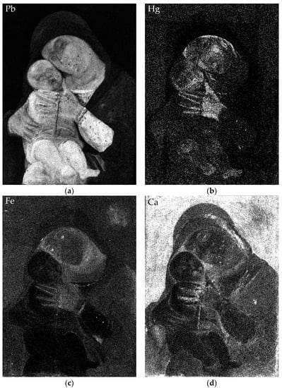 Flesh tones, in addition to Pb, are characterised by the presence of Hg (Figure 4b) used in cheeks, lips and highlights in general, both in the Virgin and in the Child, attesting the use of vermilion/cinnabar. The Virgin’s hair also contains Hg. Volumes in the Virgin’s flesh tone are built with the use of Fe-based materials, such as earth and ochres, employed mostly in shadows (Figure 4c). On the contrary, the Child’s flesh tone does not contain a significant amount of Fe-based materials (with the exception of the shading of the eyes, nose and cheeks); visually, the two flesh tones are indeed different. The Virgin’s eyes also contain Fe-based materials.