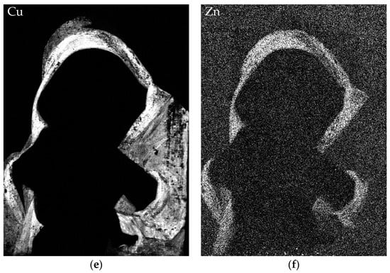 The blue mantle is painted with a Cu-based compound (Figure 4e), most likely azurite. The green border contains Cu as well and an evident amount of Zn traces (Figure 4f), which is consistent with rosasite impurities in malachite [49].