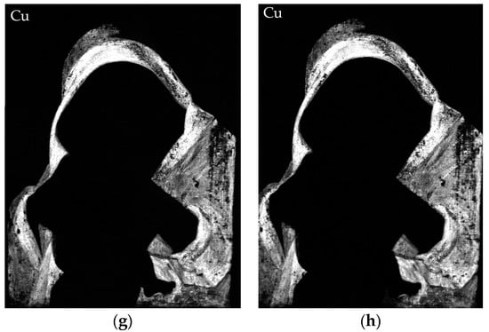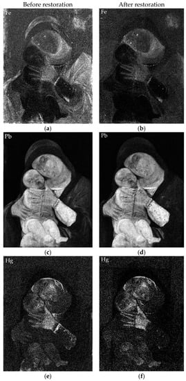 MA-XRF maps acquired before and after conservation are interesting to compare, as is visible in Figure 5. The most significant difference is visible in the Fe and Pb maps (Figure 5a,b and c,d respectively) in the blue mantle. Vermilion (Figure 5e,f) was present in the red robe of the Virgin, but after conservation it is found only in flesh tones. It is worth noting, as well, the Cu maps before and after conservation, in which no difference is evident. The comparison of the elemental maps before and after the conservation treatments has also been useful for evaluating the effectiveness of the process.