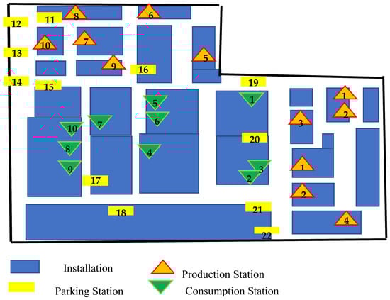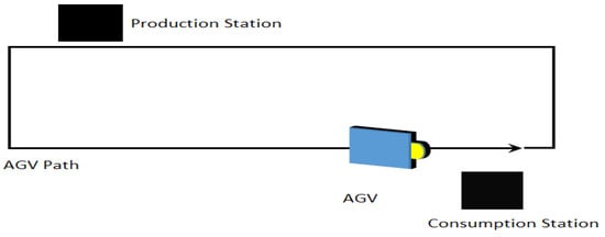 Generally, low-cost AGVs follow magnetic tape on the ground and contain a PLC as a controller. With the removal of the central control system, the AGV system evolves into vehicles operating between a single production station (where the product is fabricated) and a single consumption station (where the product is used), as shown in Figure 1. The production station and the associated consumption station form an AGV circuit.