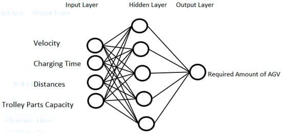 The structure of the ANN used in this study is shown in Figure 5. The ANN is composed of a three-layer network. The inputs were the velocity, charging time, distance, and hauled part count and the output was the number of required AGVs. Pearson correlation coefficient (R) and mean absolute percentage error (MAPE) values were examined to find the best ANN structure [53]. The hidden layer included five neurons. The training algorithms of Levenberg–Marquardt and Bayesian regularization were used to train the neural network model.