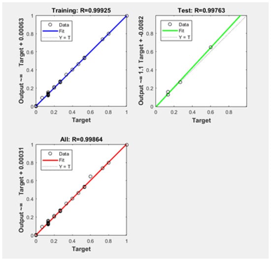 Cross-validation is a statistical technique to evaluate networks by partitioning the data into subsets of specified ratios. In this research, a hold-out method for cross-validation was used by partitioning the data into subsets, which are the data used for testing and validation and the data used for neural network model training. This technique is preferred as the dataset is small. The ANN model and predictions were saved when the Pearson correlation coefficient (R) of the test was higher than 0.998, as well as when finding better mean square error (MSE) values. The reason for choosing the MSE over the R-value is to prevent over-fitting and increase accuracy. For the dataset, 80% of the data are used as training, 10% for testing, and 10% for validation. The neural network model was run in Matlab [46]. The best performance for the training was realized with Bayesian regularization, and the performance was evaluated in terms of mean squared error (MSE) and Pearson correlation coefficient (R) values. The R-values for the neural network model were recorded for training and testing. All the R-values were computed as shown in Figure 6. Bayesian regularization backpropagation (BRB) and the Levenberg–Marquardt (LM) algorithm were used to train the neural network model. Bayesian regularization allows for better values for R (0.998) and the MSE (2.088 × 10−5). The R-value must be close as possible to 1. The ANN estimates successfully compared to RSM and MLR in R2 and mean absolute percentage error (MAPE), which were used to evaluate the prediction accuracy. They are performance evaluation results between the predicted and true value.