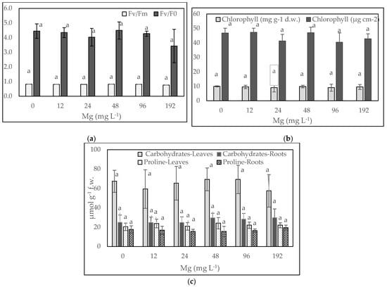 Effect of Mg concentration of the nutrient solution (0–192 mg L−1) on (a) Fv/Fm, Fv/F0 of leaves, (b) chlorophyll content of leaves, and (c) carbohydrate and proline content of leaves and roots of sweet orange plants. (All the values are the means of six replications ± S.D. Means followed by the same letter in the same column are not significantly different at p < 0.05 (Duncan’s multiple range test, n = 6)).