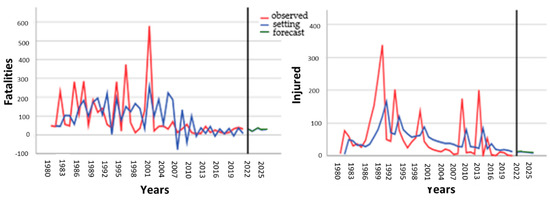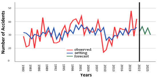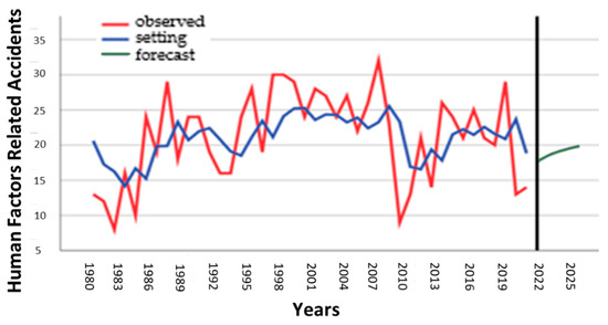 The US accidents prediction due to human factors observed (red), setting (blue), and forecast (green) (1980–2025) are shown in Figure 13.