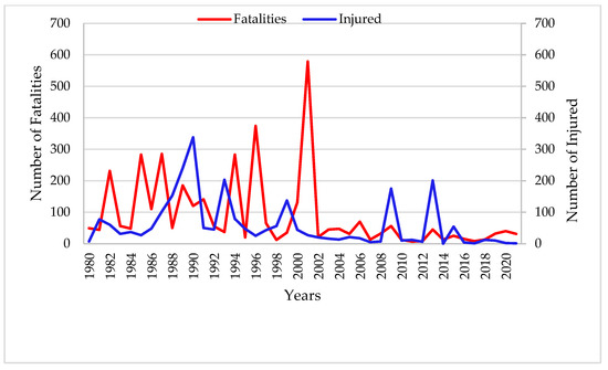 Concerning the victims of accidents, it is possible to observe in Figure 4 that this number has been decreasing in terms of fatalities (red) and injuries (blue). The most excellent highlight of the graph is in the line of fatalities in 2001, referring to the fateful day of September 11 with the terrorist attack against the twin towers. In the years that followed, it was possible to verify that there were fewer fatalities and injuries, including those of the above verified data, as well as fewer flights. Besides the number of flights, there was, after that day, a restructuring in flight and airport safety. From that day, more emphasis was given to security issues globally because it sounded an alert of the risk of new illicit events that were necessary for international organizations to adapt their regulatory framework according to the risks and the evolution of new technologies to protect civil aviation against these acts [26]. At that time, the first immediate measures to be taken were the entry of sharp materials in the List of Products Prohibited by ICAO and the need to implement more solid measures to enter the cabin doors [24]. Other measures were also taken over time. After September 11, we can observe a sharp decrease in the level of accidents with fatalities and injuries, which has been decreasing until today.