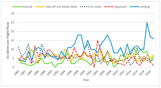 The accidents on the approach to the runway is one of the flight phases, with more accident cases at 17%. It is also one of the main phases after en route accidents with the highest fatalities. Although small, the trend of accidents in Figure 6 is a downward trend, even though it peaked in 2021.