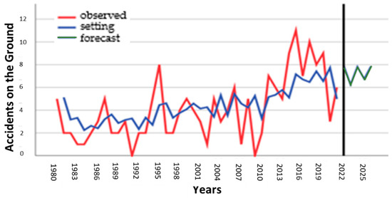The US aircraft prediction of accidents on the ground observed (red), setting (blue), and forecast (green) (1980–2025) are shown in Figure 7.