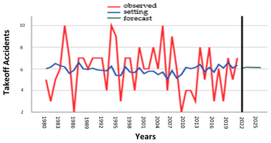 The prediction of accidents in takeoff observed (red), setting (blue), and forecast (green) (1980–2025) are shown in Figure 8.