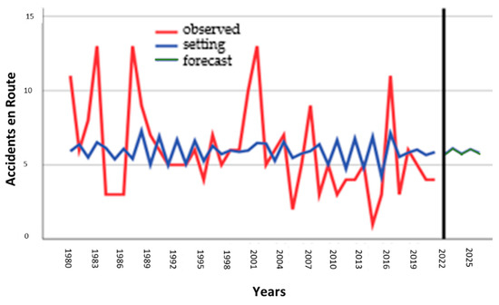 Figure 11 shows that a stabilization in the number of accidents predicted for the coming years is constant, between nine and thirteen accidents, with a tendency to decrease. A stagnation of accidents is observed in this phase.