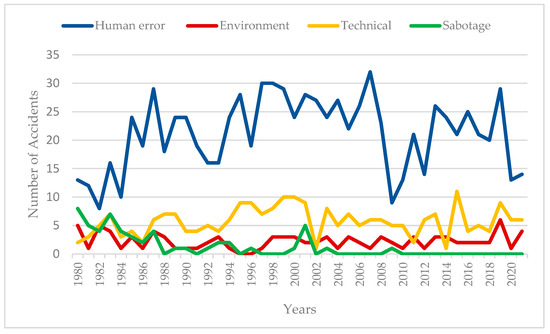 The US accidents by root cause human error (blue), environment (red), technical (yellow), and sabotage (green) (1980–2020) are shown in Figure 12.