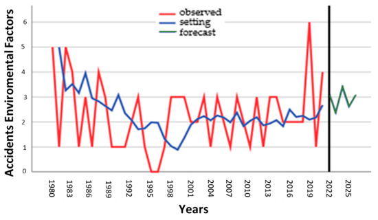 The sabotage accident prediction observed (red), setting (blue), and forecast (green) (1980–2025) are shown in Figure 16.