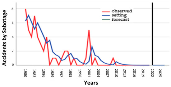 In Figure 16, the accident forecasts for the coming years show a decreasing trend with up to no accidents; in this case, we know that these values correspond to zero accidents in the coming years, knowing that they are only predicted. For example, in 2022, according to predicted values, there were no accidents due to sabotage.