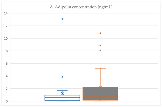 Obesity disrupts the homeostasis of the secretion of adipokines, which are biologically active molecules secreted by adipose tissue. Adipokines have many essential functions in the human body—among others, they regulate metabolic and inflammatory processes and participate in adipogenesis [1,2,3]. The number of newly discovered adipokines is systematically increasing, and due to their pleiotropic effects, they have become an interesting research area. High hopes lie in their use as early biomarkers associated with the development of metabolic syndrome in overweight individuals.