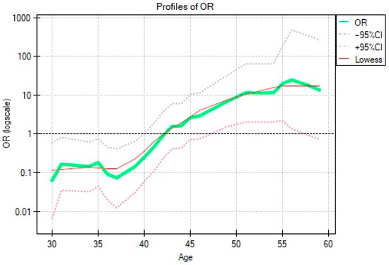 Profiles of odds ratio (OR) of adipolin levels above median value in different ages of individuals from the no-obesity group (n = 37).