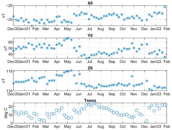 The main measuring instrument of the magnetic observatory is a vector three-component magnetometer (variometer), which allows to measure variations of the total magnetic induction vector B. Obtaining the vector B total components from the variometer data is done by adding baseline values to the variations [,,]. Observatories calculate baseline values based on absolute measurements, which are performed manually 1–2 times per week. One known disadvantage of the variometer is the temperature drift of the readings [,]. The temperature dependencies of a fluxgate sensor are often caused by temperature-dependent variations in the magnetic susceptibility of the material from which the coil cores are made. In addition, the temperature-dependent components of the sensor electronics also contribute to temperature drifts [,]. In order to reduce the drift effect, variometers are installed in thermostatically controlled pavilions that maintain the daily variation in sensor temperature at 1–2 °C. Such stability is difficult to achieve over the entire calendar year due to the dramatic summer and winter temperature variations. Magnetic observatories located in sharply continental climates are affected by annual variations of outdoor temperatures from −40 °C to +30 °C. Maintaining a stable sensor temperature in such conditions becomes problematic, especially due to the limited power supply in areas of distant observatories. Absolute measurements allow correcting temperature distortions on seasonal or monthly scales, while correcting daily or weekly scale distortions is a non-trivial task when preparing the definitive data [,].