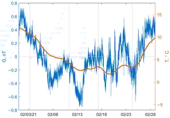 On 4–5 November 2021, there was a fairly strong geomagnetic storm, which was reflected by the value of the planetary geomagnetic activity index Dst = −105 nT. Figure 4 shows the G and temperature plots of the variometer sensor of the SPG observatory during this storm. It is evident from the figure that the change in G values during the magnetic storm was caused by nothing other than an increase in temperature in the variation pavilion.
