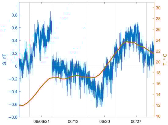 Many other environmental observation instruments are subjected to temperature drifts, so it is a common problem in data quality control (e.g., [,]). However, the proposed method for the measurement correction was adapted to the combination of two sensors (fluxgate and Overhauser proton) specifically designed for magnetic observations and based on different physical principles. This combination enabled revealing distortions in each other’s data. Therefore, the method was barely applicable to correcting measurements from other type of sensors.