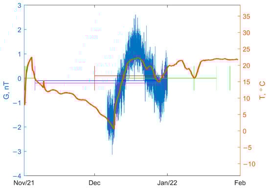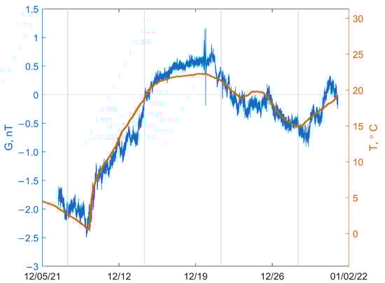 The temperature-dependent deviations of G from their usual permissible values during the first 12 days of December turned out to be too large, and the G plot itself was no longer a criterion of the quality of the obtained data, but a scaled and shifted temperature plot. As in the case of the data for February of the same year, adjusting the G plot by discarding the observed baseline values was unsuccessful due to the impossibility of accounting for intraday temperature variations. While the February 2021 G plot shown in Figure 2 was somehow acceptable as a criterion for the quality of the quasi-definitive data [], the December 2021 G plot shown in Figure 5 cannot be evidence of the reliability of the obtained data.