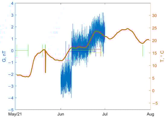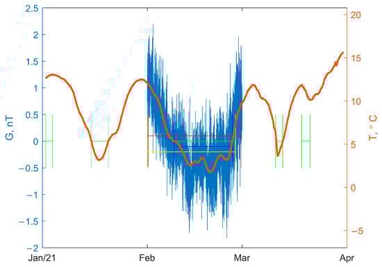 The INTERMAGNET requirements allowed a brief excess of the G threshold deviation of 0.5 nT during the geomagnetic storms. However, in this case, a segment with a peak amplitude of ~3 nT had a long duration (more than 4 days). It was caused by a local temperature change rather than by rapid magnetic field variations during a geomagnetic storm. Accordingly, such data without temperature correction were not reliable.