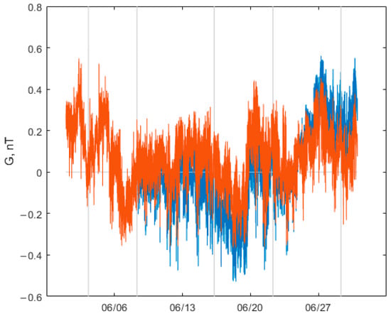 The G-mean(G) plot for June 2021 after correcting May data is shown in Figure 8. The difficulty with this case was that this graph contained a jump on 8 June, so only its left or right side could be corrected using a single interval. However, it should be noted that the graph a + bT from mid-May crossed zero on May 16 and June 8, precisely in the vicinity of the jump in the data. Thus, the 1–8 June data correction was successfully implemented in the course of the temperature correction of the May 2021 data, using an extended localization interval up to the June break point. The result is the constancy of the G-mean(G) plot for 1–8 June in Figure 8 (here, the plot was still biased from zero, as centered G variations with constant offsets were considered).