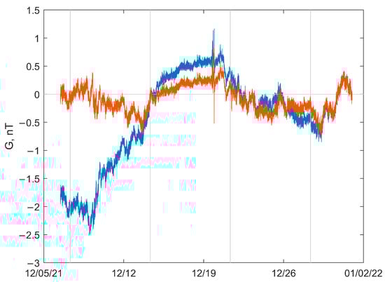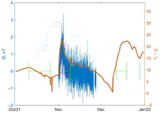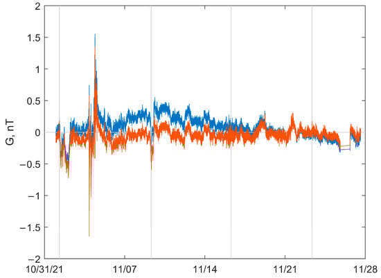 The G-mean(G) plot for November 2021 is shown in Figure 10. It is characterized by a bell-shaped form at the beginning of the month during a magnetic storm. The graph then tends to decrease towards the end of the month, which correlates well with temperature. Typically, such a constant trend is eliminated by the standard application of a daily smoothed baseline. However, the graph G, without the temperature correction shown earlier in Figure 4, demonstrated that the trend is not fully eliminated by the standard procedure, so a temperature correction at the end of the month is still desirable.