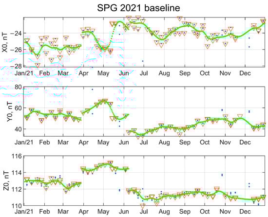 Thus, the baseline values are nothing more than variometer calibration corrections that eliminate long-term drifts. The stability of the baseline values and baseline-dependent G record throughout the year is a basic indicator of the quality of the data provided by the observatory [,].