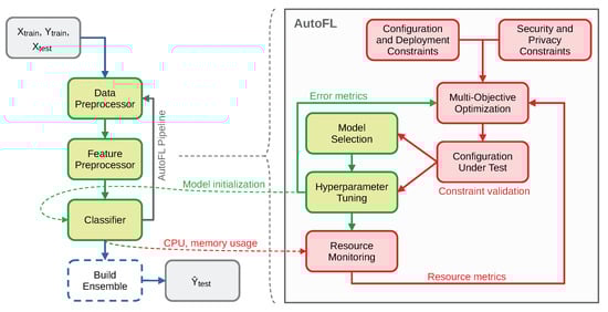 Flower [31,32] is a federated learning framework that supports both classical machine learning and deep learning models. Compared to other frameworks, such as PySyft [33] (https://github.com/OpenMined/PySyft, accessed on 1 May 2023) or TensorFlow Federated (https://www.tensorflow.org/federated, accessed on 1 May 2023), Flower is ideally suited for research purposes because of its simplicity, its ability to be deployed on edge devices, and its support for on-device training of federated learning algorithms. Our framework leverages and extends Flower to realize AutoML in a federated learning context, hereby exploring different trade-offs and optimization objectives.