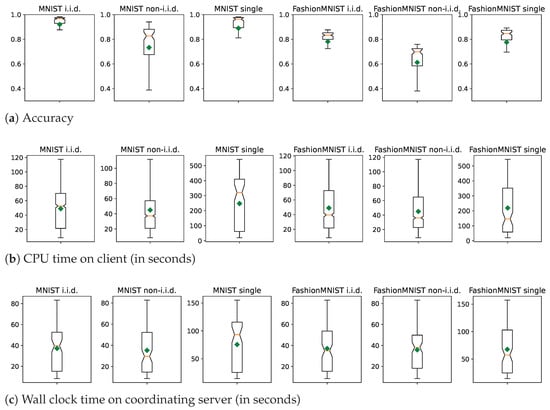 In our federated learning experiments, we make use of well-known datasets, such as MNIST (http://yann.lecun.com/exdb/mnist/, accessed on 1 May 2023), Fashion-MNIST (https://github.com/zalandoresearch/fashion-mnist, accessed on 1 May 2023) and CIFAR-10 (https://www.cs.toronto.edu/~kriz/cifar.html, accessed on 1 May 2023). The way these datasets are distributed across the different clients in the federation can be configured: