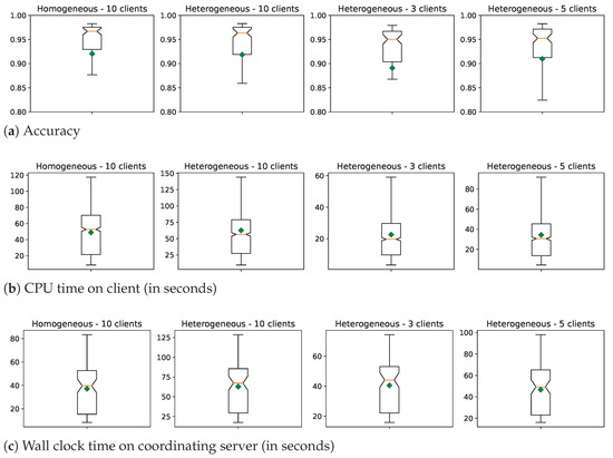 System heterogeneity in federated learning is the result of unbalanced computational resources and/or communication bandwidths across the clients, causing stragglers to indeed increase the federated training time. This is why federated learning algorithms typically perform multiple local iterations on a fraction of randomly sampled clients before aggregating the local model updates via the central coordinating server [23,24]. Konečný et al. [5] explored different methods to reduce the costs of uplink communication. These methods include (1) structured updates, where updates are learned from a restricted space that is parameterized with a small number of variables, and (2) sketched updates, where full model updates are learned which are compressed with combinations of various techniques including quantization, random rotations, and subsampling before the update is sent to the server. The authors experiment with CIFAR-10 image data for image classification and the Reddit post data for next-word prediction. Their experiments show that there are trade-offs, amongst others, between the accuracy, the various communication cost reduction techniques, the number of rounds, and clients in the network. However, the experiments start with a predefined neural network, reusing “Model C” from [25] for the CIFAR-10 experiment and a custom LSTM model for the Reddit data experiment.
