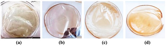 Plant–chitosan membranes (a) CS 1 membrane, (b) CS1–Ly 0.5 (1% standard chitosan with 0.5 g/L Lythri herba extract) membrane, (c) CS 1–Ly 1 (1% standard chitosan with 1 g/L Lythri herba extract) membrane, (d) CS 1–Ly 2 (1% standard chitosan with 2 g/L Lythri herba extract) membrane (representative images).