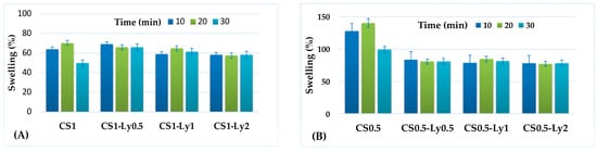 Membrane percentage of swelling tested as a function of time (min) and chitosan concentrations. (A) CS 1 and mixture with 0.5 g/L, 1 g/L, 2 g/L Lythri herba extract (CS 1–Ly 0.5, CS 1–Ly 1, CS 1–Ly 2). (B) CS 0.5 and mixture of 0.5 g/L, 1 g/L, 2 g/L Lythri herba extract (CS 0.5–Ly 0.5, CS 0.5–Ly 1, CS 0.5–Ly 2).
