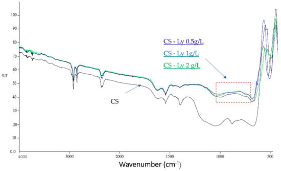 As shown in Figure 4, the CS–Ly membranes showed absorption bands common to those of the simple CS membrane at wavenumbers 3736 cm−1, 2918 cm−1, 2849 cm−1 and 2358 cm−1. Based on the literature data, the results can be interpreted as follows: the common transmittance band of all four samples at 3736 cm−1 can be attributed to the O–H stretching vibrations of the -CH2-OH group or the glycosidic ring involved in intramolecular hydrogen bonds [] that overlap with the N-H stretching vibrations of the primary amines in the samples subjected to infrared (IR) analysis. The corresponding common peaks at 2918 cm−1 and 2849 cm−1 are characteristic of the C-H vibrations of the methine groups in the pyranose nuclei of CS, CS–Ly membranes and polyholozides from the lyophilized extract. The common peak recorded at 1650 cm−1 is attributed to the ν(C=O) stretching vibrations of the C=O from the NH–CO–CH3 group (amide I band) of CS and its mixtures [], and the one at 1398 cm−1 corresponds to the C-N (amide III) stretching vibration. The C3–OH and C6–OH groups present in the CS structure were characterized by the peaks recorded at 1044 cm−1 and 900 cm−1 [], but after the formation of the membrane by mixing with lyophilized extract, these peaks were not found in the spectra of CS–Ly membranes (Figure 4). Additionally, the spectra of CS–Ly membranes exhibited two peaks of low intensity at 1536 cm−1 and 1618 cm−1, which can be attributed to aromatic rings. These peaks are suggestive of the presence of polyphenolic acids, phenolic acids or tannins, which are specific to the chemical composition of the lyophilized aqueous extract (Ly).