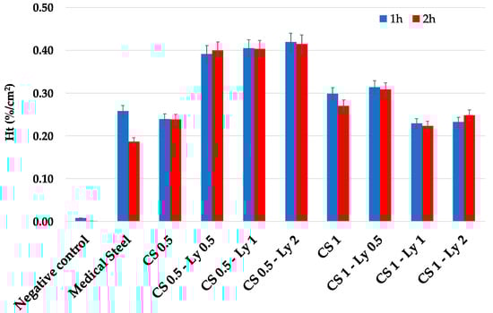 The hemolysis effects were between 0.2 and 0.4%/cm2. Also, no significant differences were recorded between 1 h and 2 h. It was noted that with hemolysis, the amount of Ht (%) increased when the CS concentration was smaller (0.5%) in the mixture’s biofilm (Figure 5) as a result of the weakening of the bonds between chitosan and the plant extract compounds. The biofilm formed by the CS–Ly mixture allowed the amine groups to bind to the polyphenols in the extract []. Chitosan interacts not only with red blood cells, but also with platelets through amine groups that are attracted to the negative charge of blood elements []. In the case of the analyzed membranes, the hemolysis effect was low and perhaps determined by the groups left free after the interaction with the extract.